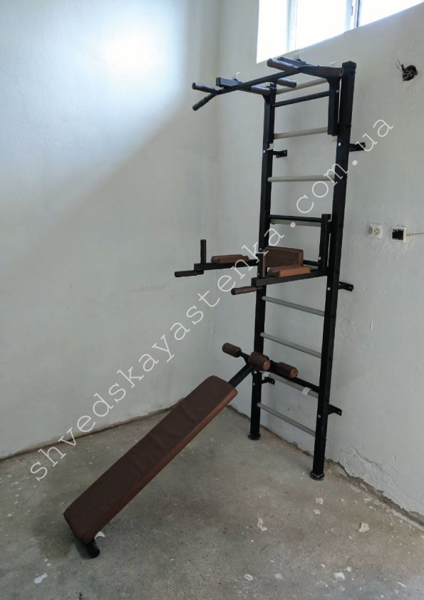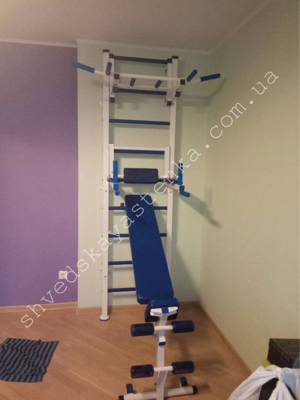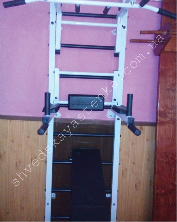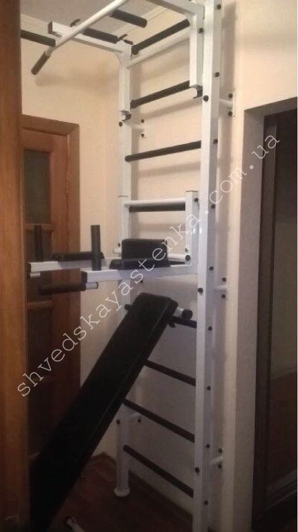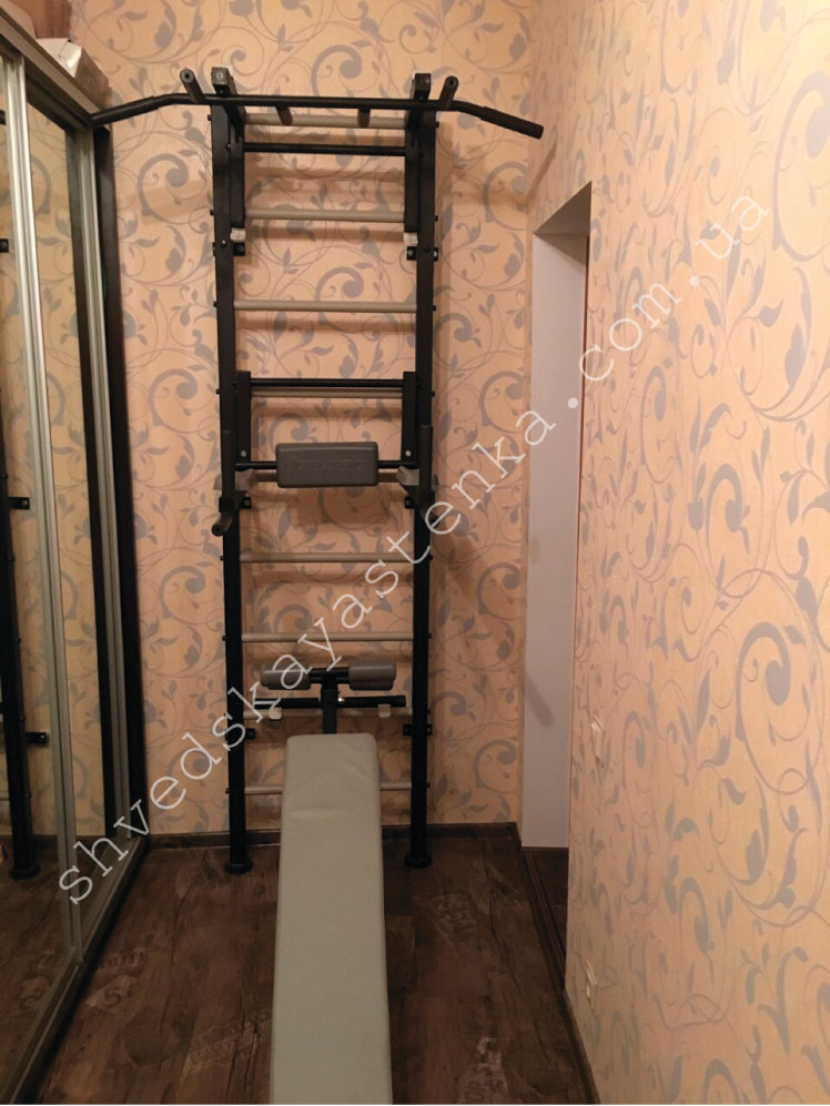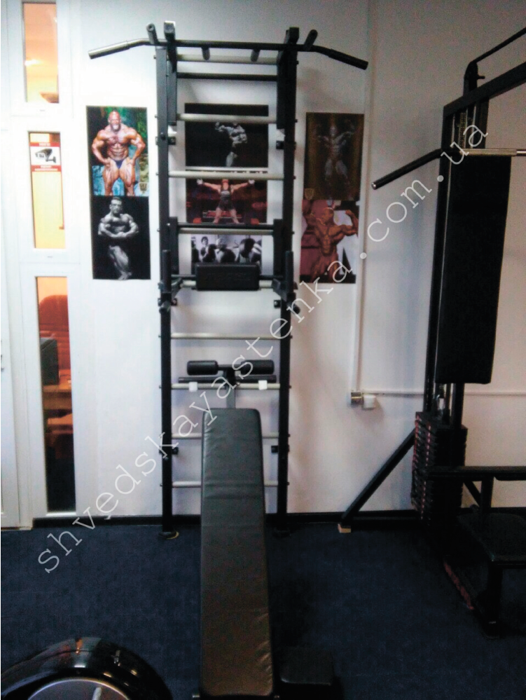 Усиленная шведская стенка Атлант от фирмы Ладас - это лидер линейки, лучшая в техническом плане. Боковые стойки выполнены из двойного профиля, рама выдерживает колоссальное напряжение в 150 кг, ступеньки гимнастической лестницы увеличенного диаметра покрыты антискользящим хромированым напылением, это гарантирует сохранение сцепления даже с влажными руками. Турник может передвигаться по высоте, есть место для грифа штанги, выдерживающее вес в 100 килограмм, присутствуют три вида хвата: параллельный, стандартный и широкий. Все зацепы с помощью которых перекладина крепится к основе так же имеют пластиковые набивки для того чтобы оплетка перемычек не повреждалось. Кожзам, которым обтянут мебельный поролон, пористый, спина при жиме не соскальзывает. Лавка улучшенная и базируется на железных брусах, на ней установлены дополнительные валики и съемный подголовник. Все ручки сделаны из резинопластмасса и напаяны, это исключает нежелательные прокручивания при выполнении отжиманий и виса. Все навесные элементы с более мощной базой и гораздо шире младших модификаций. Центр реабилитации участников АТО, спортивные фитнес клубы, оздоровительный санаторий в Трускавце - это лишь малый перечень учреждений в которые заказывали этот спорткомплекс.